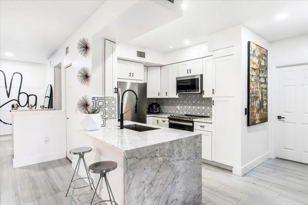 Modern and meticulous three bedroom two bath townhome with garage in Aventine at Miramar. Clean lines, designer finishes, and full of good vibes. Completely upgraded kitchen with white cabinets, stainless appliances, and waterfall countertop. Both bathrooms are redone and beautifully upgraded. Every space feels polished. The balcony brings true tree house tranquility with peaceful lake views. Resort style amenities including two pools, fitness center, tennis, playgrounds, jogging and biking trails, BBQ areas, and community parks. Prime Miramar location with quick access to major highways and minutes to top shopping and dining.