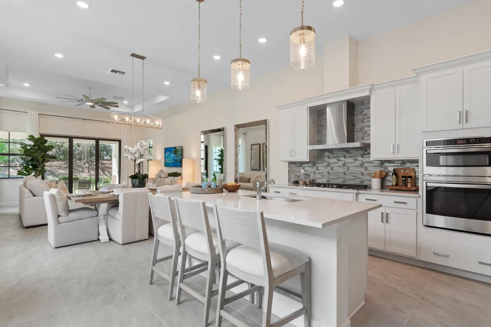 This single-story home combines low-maintenance living with plenty of room to grow and entertain. Upon entry, a seamless open-concept layout is situated among the kitchen, dining room and living room, with a covered terrace to provide outdoor moments. On the opposite side of the home, there are two secondary bedrooms split by a Jack-and-Jill style bathroom for enhanced livability. In a private corner, the owner's suite provides a tranquil retreat with a spa-style bathroom and walk-in closet. Photos are for illustrative purposes only. Tesoro Club is manned and gated with roving patrol and has incredible onsite amenities including two clubhouses, a golf course and luxe, resort-inspired swimming pools. Photos are for illustrative purposes only.